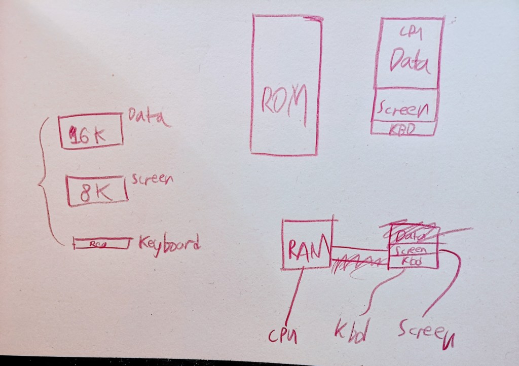 …no. Here’s the last problem: most RAM chips have 1 byte of data per address. The Hack CPU (and also the screen and keyboard), however, expects 2 bytes of data for each address. The solution I came up with is just to use two chips of RAM hooked to the same address: one chip holds 1 byte of data, the other one holds the other byte. Then the CPU can simply read from both when trying to access 2 bytes.