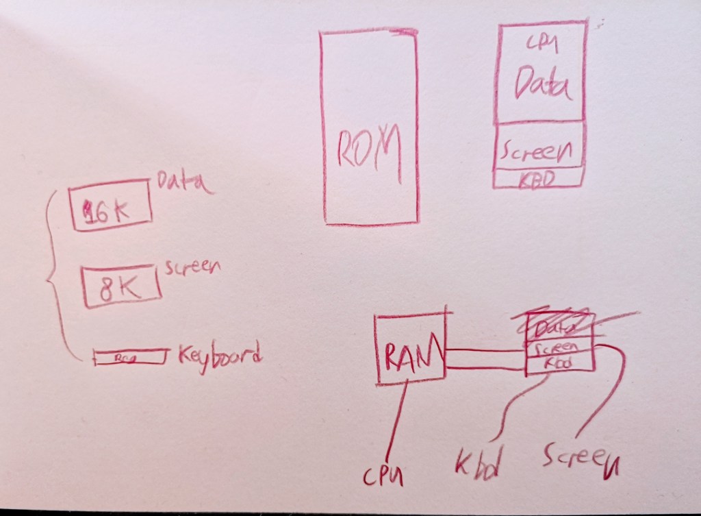 I realized I have a problem. One RAM chip only has one address but will have to be connected to three other parties. The reason this doesn’t work is that the three parties might want to read three different addresses of RAM, and (unless you use dual/triple port ram) the RAM doesn’t like that. It only allows reading from one address at a time.