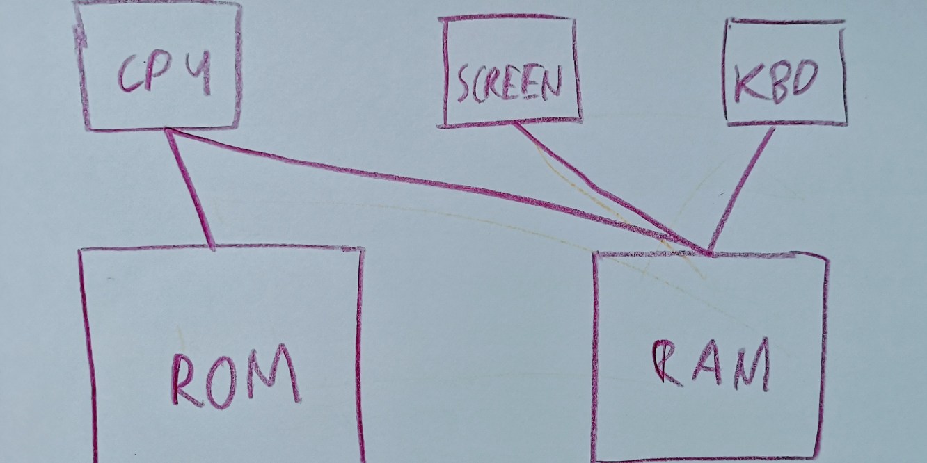 But wait, what about the keyboard? It turns out that only the CPU needs to access the entire RAM, the screen and the keyboard only need to access a few parts of it. So we can have both a single RAM chip for the CPU to access, and two separate RAM chips (the screen and the keyboard) for the screen and the keyboard to access. We can use the copying scheme from before for the screen, but what about the keyboard?
