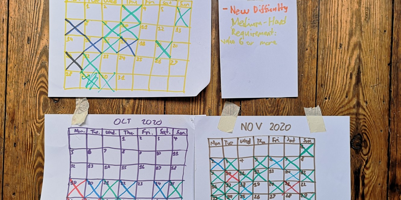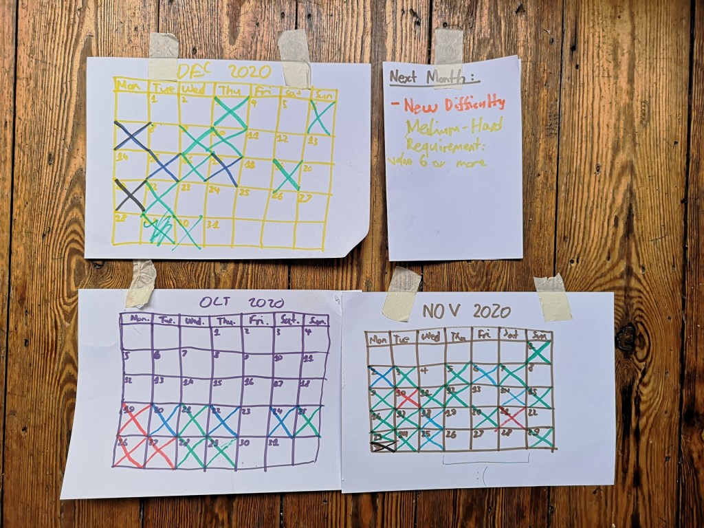 Because Simon’s regular in-person piano classes stopped due to the pandemic, he has tried various techniques to keep practicing on his own until he would be able to take lessons again. He tried programming a sketch that would calculate an exact time he would have to practice, incrementing the practice time by 2% every day, but that soon became tedious (setting up the timer, sessions quickly stretching too long, ways to improve the code more satisfying than the actual piano practice).