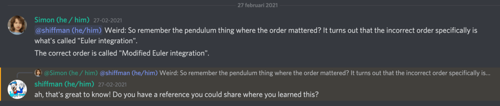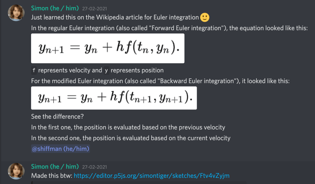Simon discussing the idea with The Coding Train’s Daniel Shiffman on Discord: