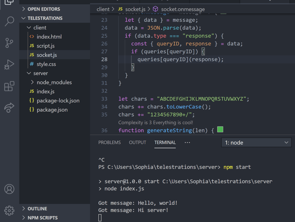 In January, Simon started a project to make a digital version of Telestrations. It was a very tough server side programming project. Originally, Simon tried to make his own socket library with five protocols (see screen shot below), but later abandoned that idea and switched to socket.io. He seems to have lost interest in the project along the way, probably because of the difficulty level, but he did manage to test the protocol for two users and had a lot of fun pondering the architecture.