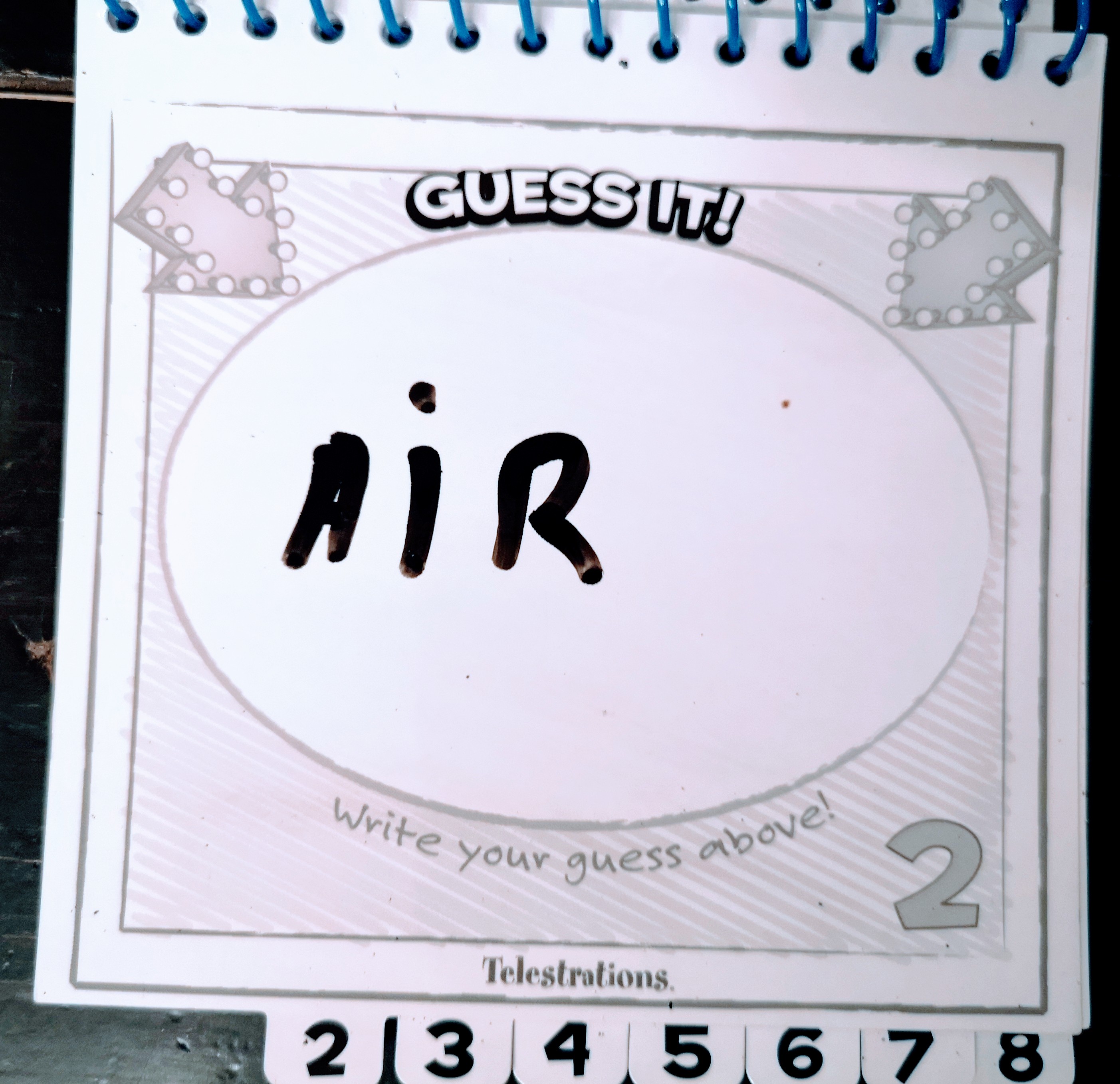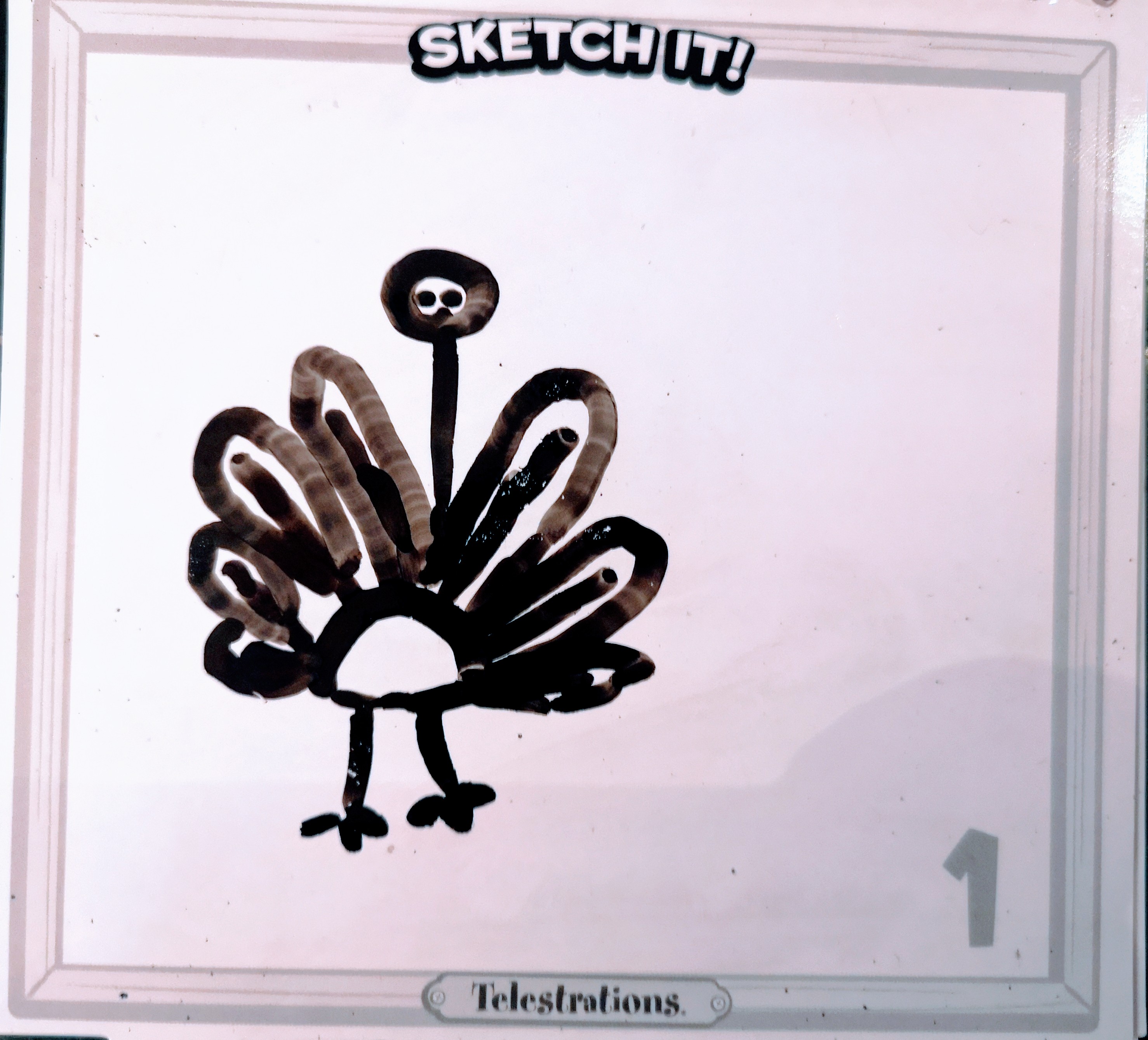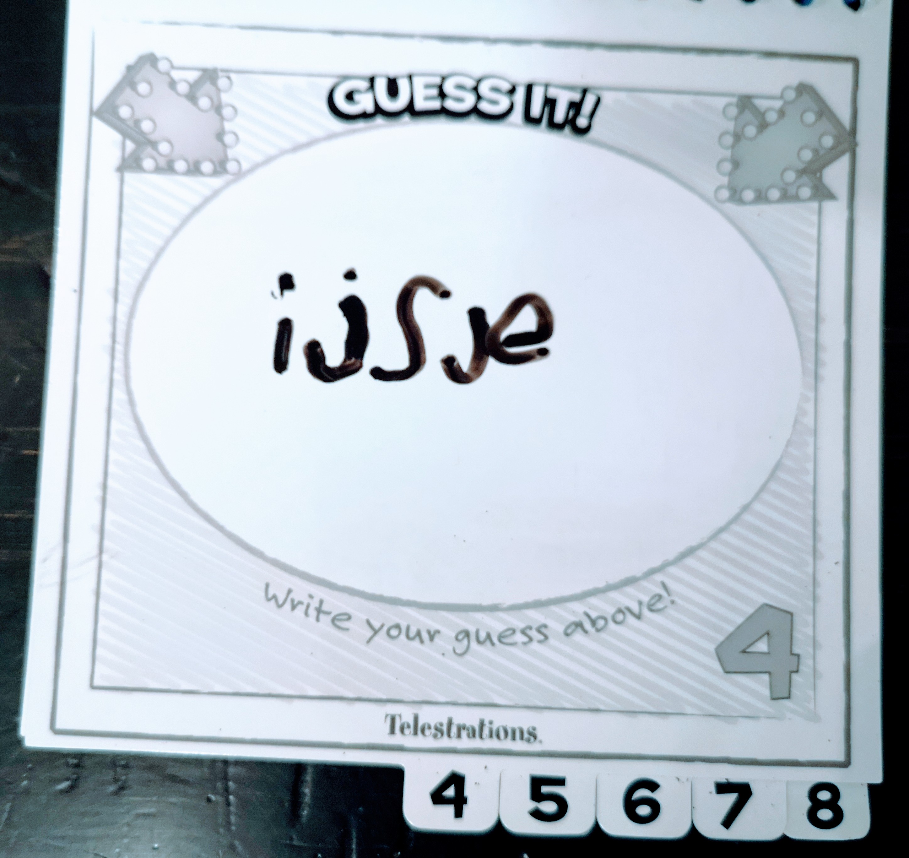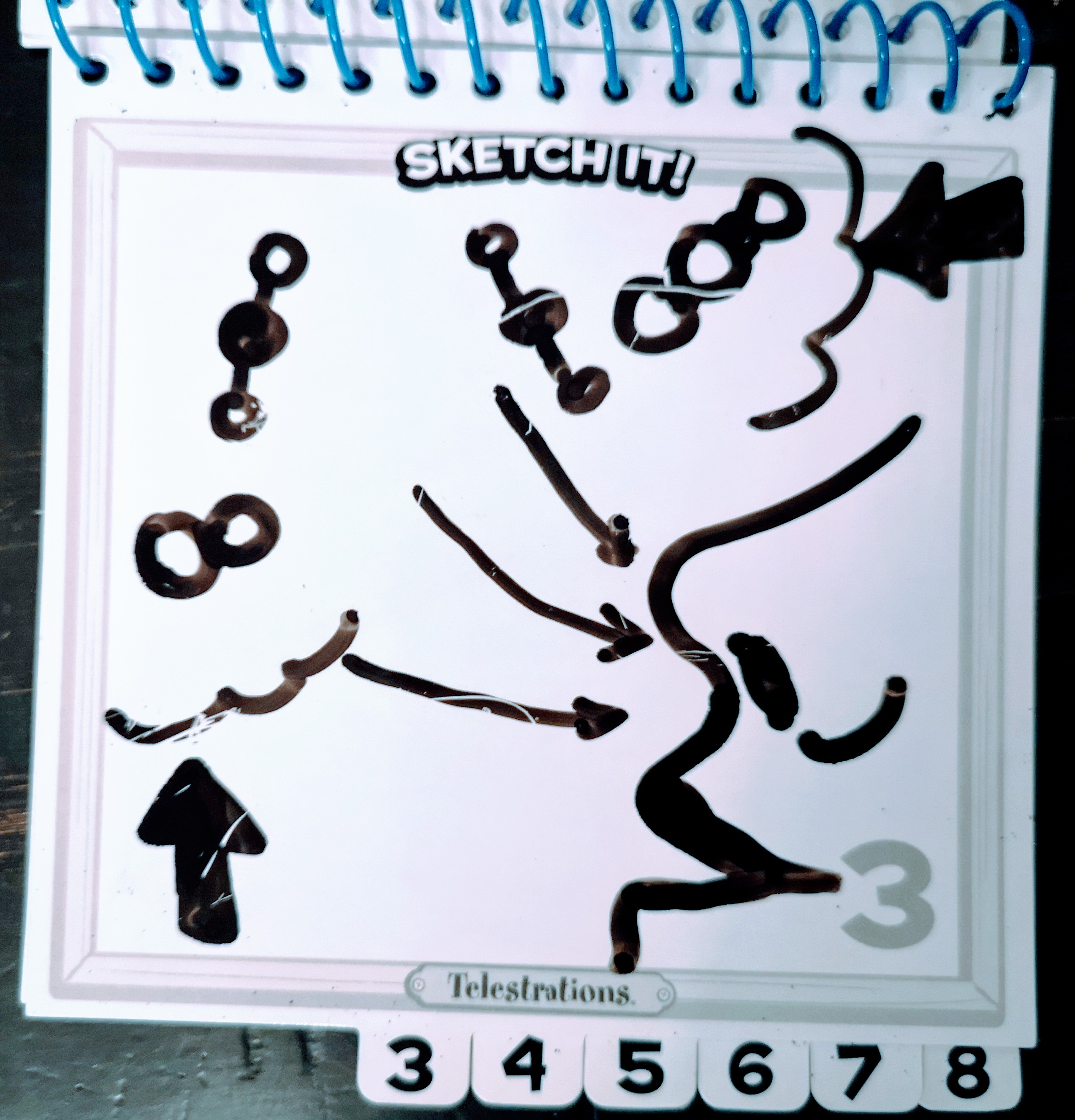 One of our favorite games to play together is Telestrations, a version of the telephone game where players illustrate a word and pass it on for the next player to guess what they drew and write the guess down. The following player illustrates that guess and passes the illustrations to their neighbor and so on, until the sketchbook makes a full circle and returns to the player who came up with the original word. Four to eight players can take part, so there’re four to eight sketchbooks circulating simultaneously. Most of the time, the final guess is not the same as the original word but bears some resemblance to it in this way or another, almost always hilarious. I don’t remember us ever laughing that hard, literally until our abdominal muscles hurt.