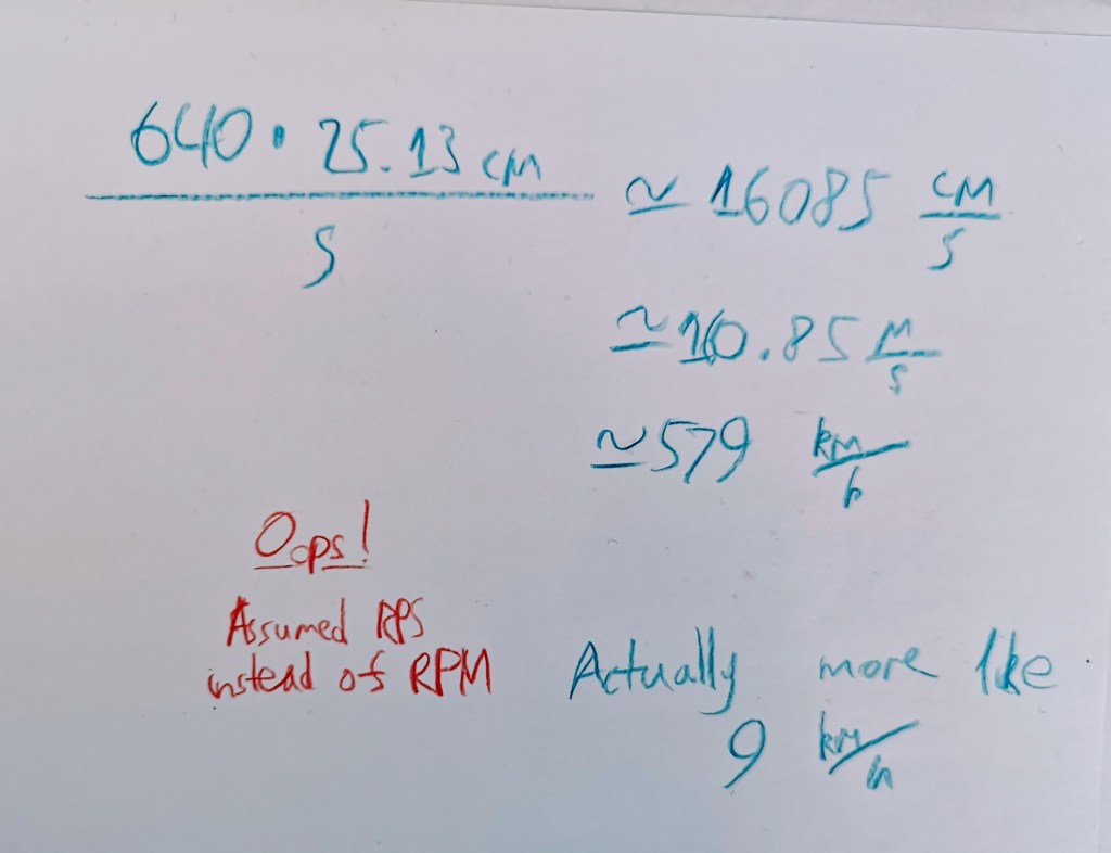 I wanted to convert that to a phyiscal speed, just for fun, so I measured the radius of the fidget spinner (4cm), and I multiplied that by 2π to get the circumference. I then multiplied that by the RPM to get the speed, and I got approximately 9 km/h. That’s not a car’s speed, but it’s still impressive it can get to my running speed 🙂