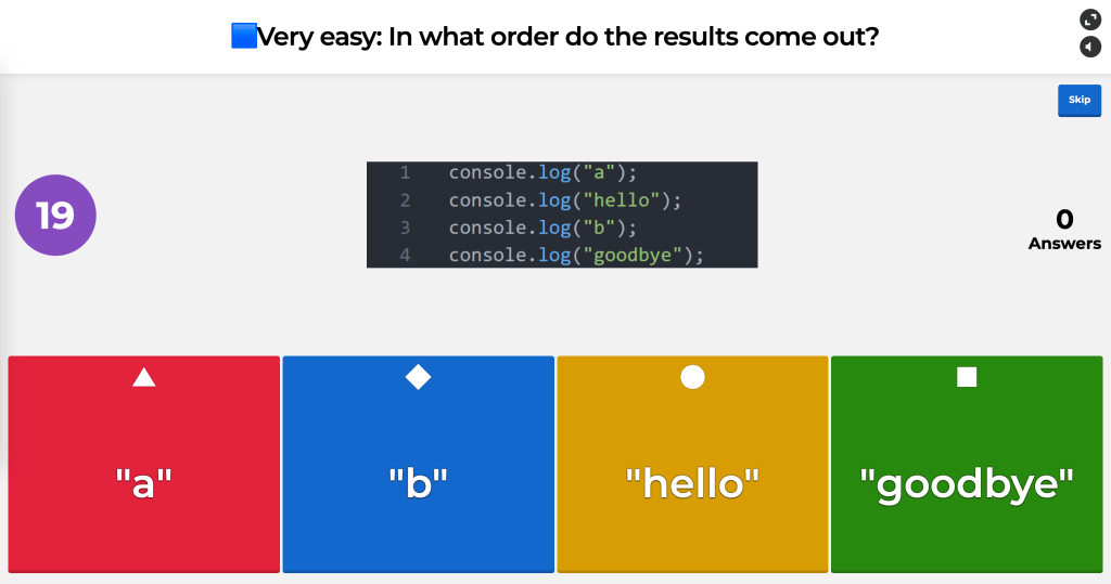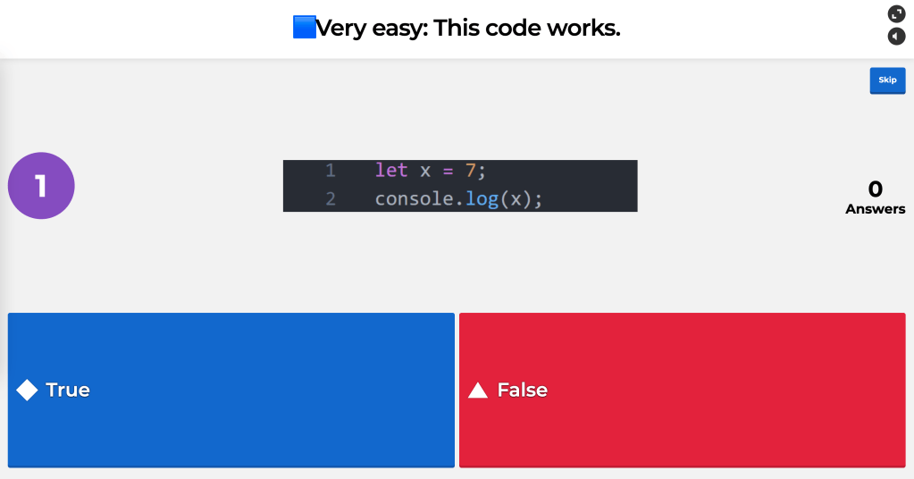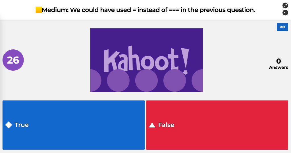 Simon and Neva crafted this awesome (and not very easy, at least from my noob perspective) entry level JavaScript quiz. I’m including all the 15 questions below, so that if you wish, you can play it as well or maybe even recreate it in your Kahoot account. If you’re not sure about the answers, leave a comment and Simon or Neva will help.