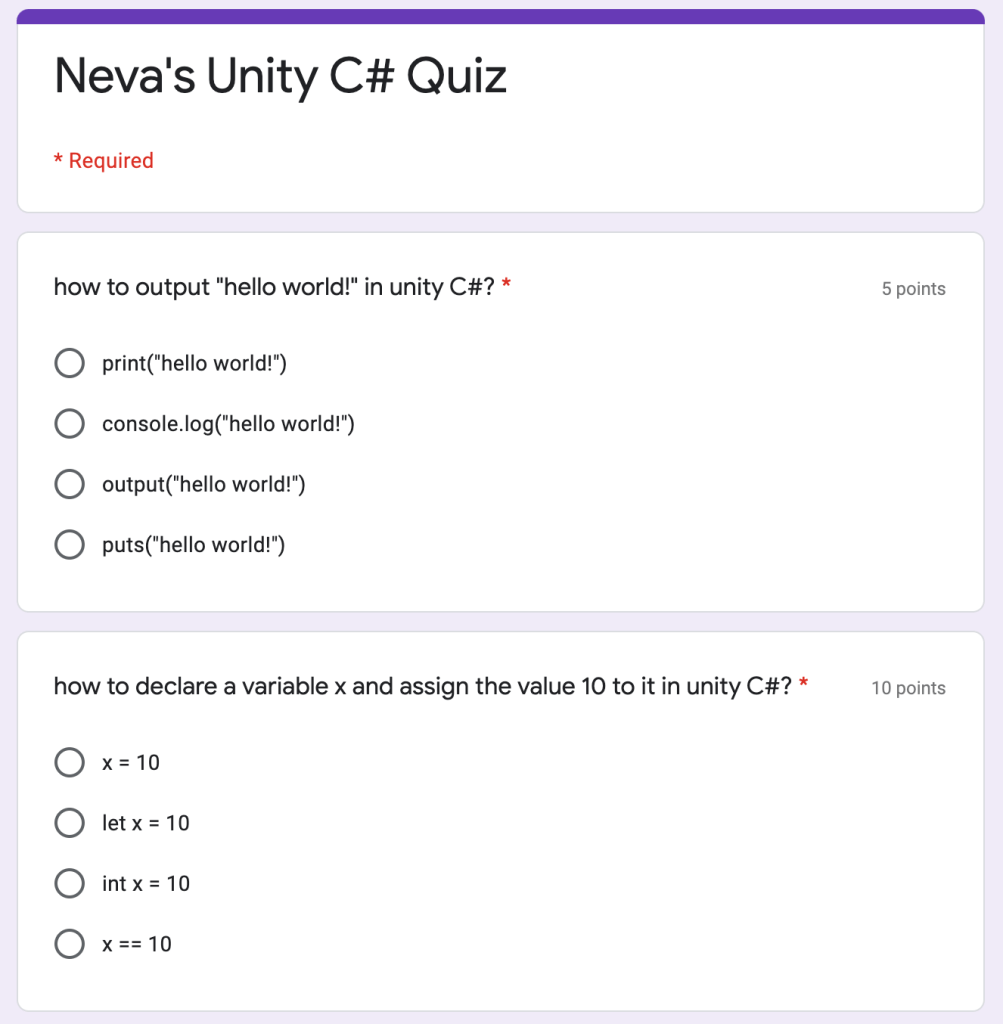 Simon also invited Neva to watch the Unity tutorials together. As Neva really likes making quizzes, she created this quiz about C# based on what she learned. You can try the quiz yourself at https://forms.gle/Y4UpvqdvCPV5Fq1u9