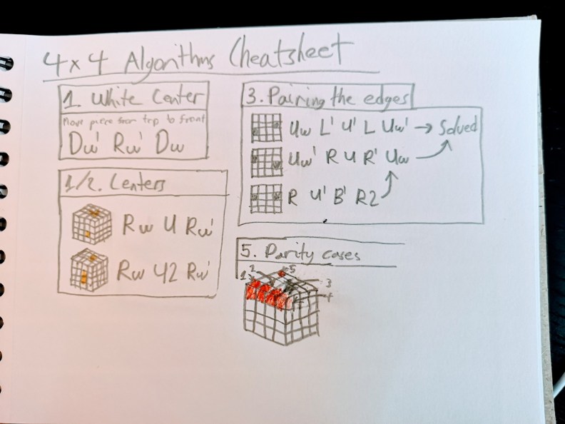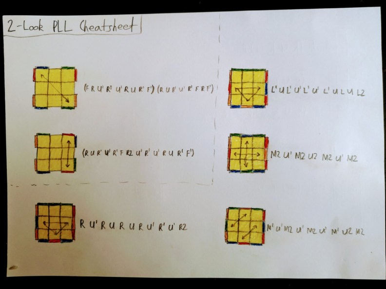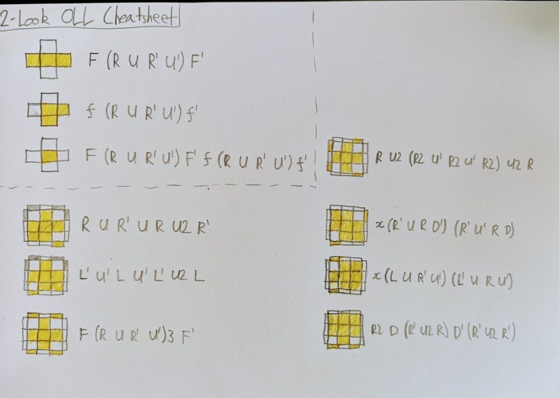 He has also ordered a load of speed cubing gear at the Speed Cube Shop and aspires to become a legit speed cuber. Below are the cheat sheets he makes for himself on paper and then memorizes.