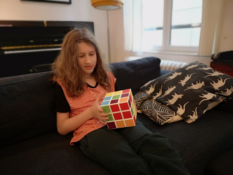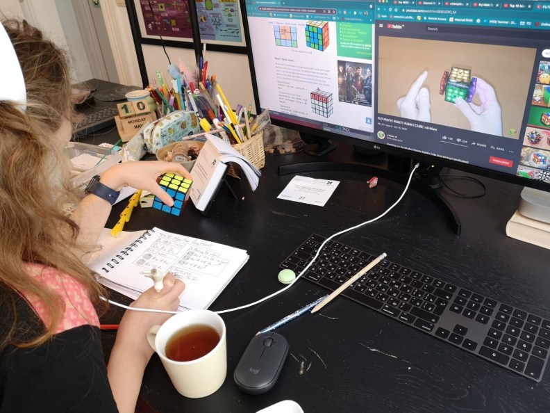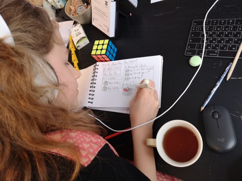 Simon has already taught himself how to solve the 3×3 and the 4×4 using “the simple algorithms”. The new challenge is the so called CFOP (The Rubiks’ Cube Friedrich method), a quicker, trickier set of algorithms. It consists of the following steps: Cross (white cross at the bottom), F2L (solves the first two layers at the same time) , OLL (orient last layer – orients it so that the top is all the same color), PLL (permute last layer – puts all the pieces in the right place and doesn’t affect the orientation, therefore solving the cube).