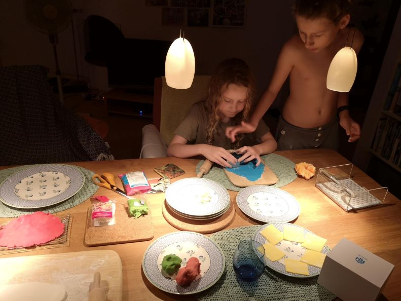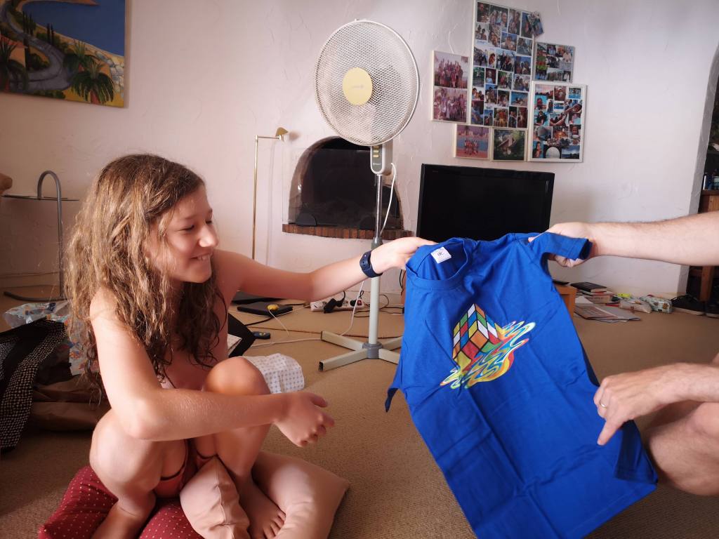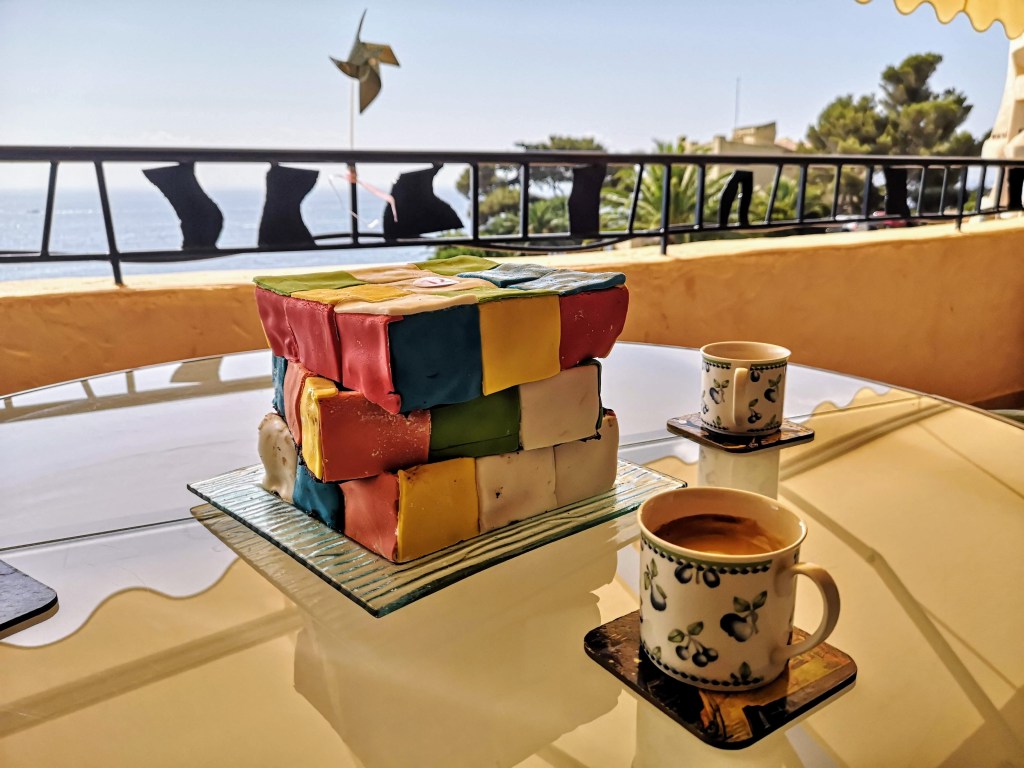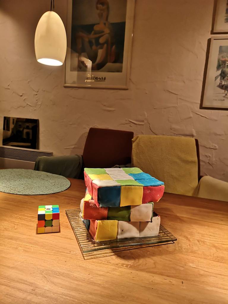 It was Simon’s birthday yesterday and as this year is all about cubing, yesterday was no exception. It has sort of become a tradition to celebrate his birthday at our uncle’s house in Southern France and start the day with a themed presents hunt (this year, full of cubing trivia). We knew Simon wanted to bake a 3×3 birthday cake long in advance so we came to France equipped with cube-shaped baking trays, colorful fondant and square cooky cutters. We had done our research and conjured the basic design while still at home in Belgium: Simon wanted a cake that could turn along at least one axis.