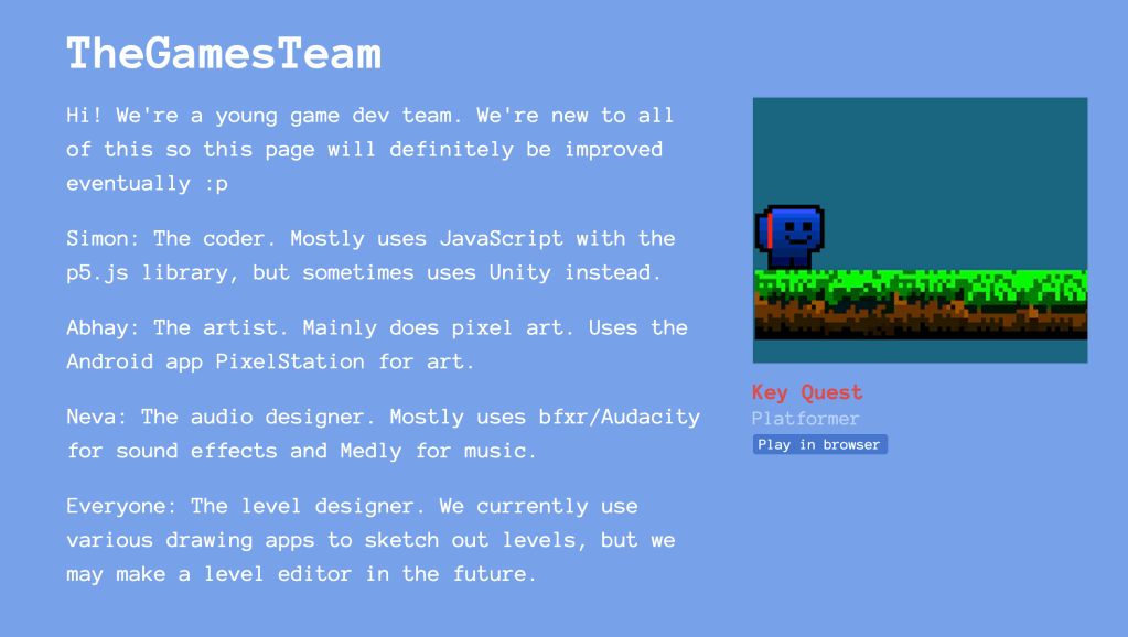 Please check the game out at https://thegamesteam.itch.io/ and leave some comments! The code is open source at https://github.com/The-Games-Team/Key-Quest