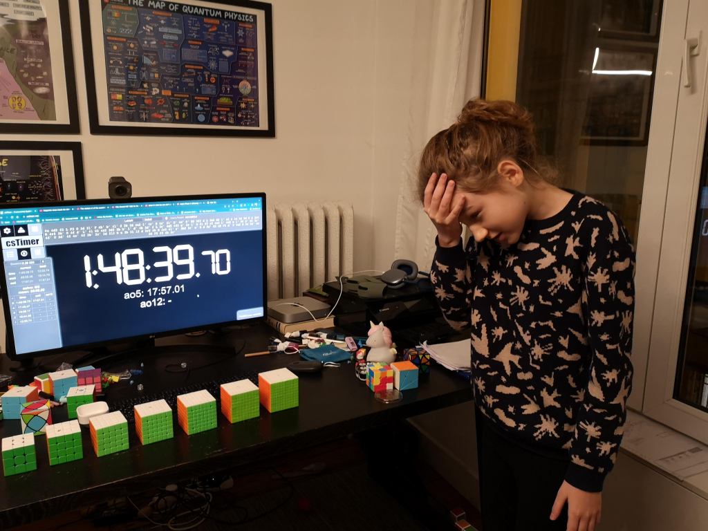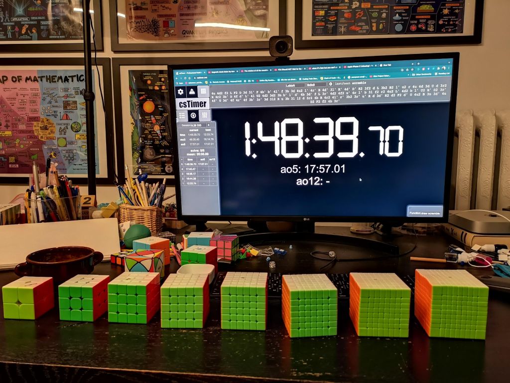 This Monday, Simon also challenged himself to solve all his nxn cubes (2×2 through 9×9) in one go. He says he has never felt as mentally exhausted and proud of how fast he is.