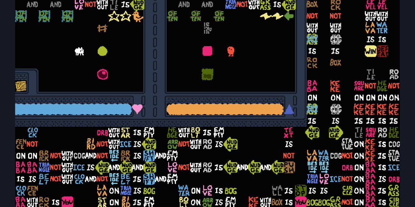 With a normal game, the rules have to be intuitive, otherwise the player will get shocked right when they start the game. With Baba is You, however, the rules can change. So they can just start simple, and gradually get more mind-bending along the way. This allows it to do some really cool things, e.g. have the level select screen also be a level, be winnable, and later on in the game, even have it be a challenge. In the late game, sometimes accessing a level is literally more complicated than the level itself.