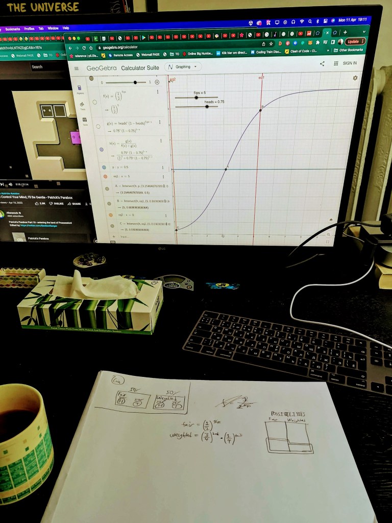 A couple days earlier, he had programmed a coin tossing game and was coming up with optimal strategies to play it. He used Bayesian inference and plotted a graph in Geogebra when he noticed something paradoxical: mathematically, he got different predictions depending on whether he knew the order of tosses or not – seemingly irrelevant information. This reminded him of the famous boy-girl paradox, a problem in which seemingly irrelevant data about whether a child was born on a Tuesday helped estimate the child’s sex more correctly. The coin tossing paradox held Simon’s mind hostage for a few days.
