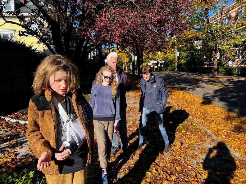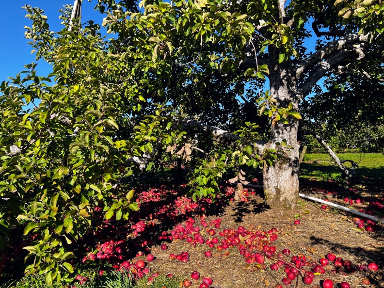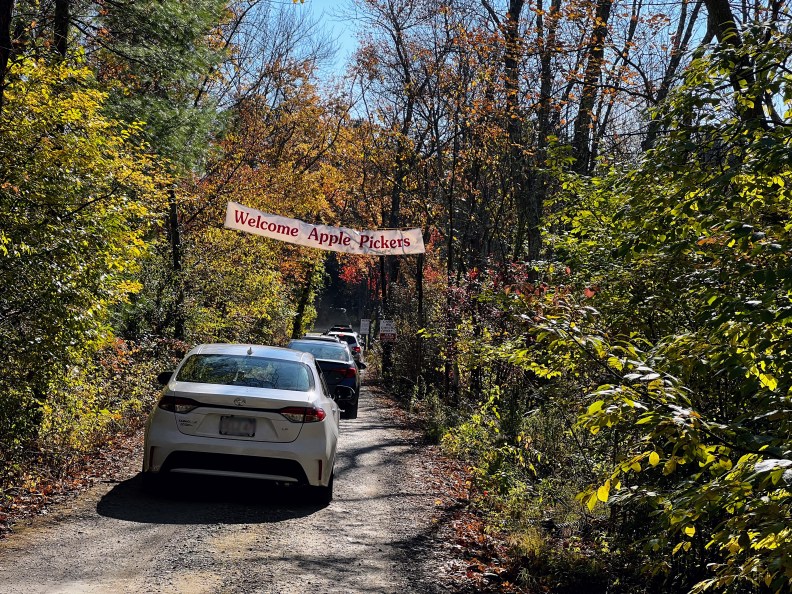 Because of his broken arm, Simon can’t visit even the meager playgrounds available in our area, to say nothing of the swimming pools. In fact, that’s where he broke his arm — at a small playground, balancing on the only creative structure he found in the absence of more advanced and vertically challenging climbing options. Considering the kids like trees so much, we (the parents) decided to go leaf peeping, as they call it here. And, to make it more fun, we planned a trip to an apple orchard, to pick apples.