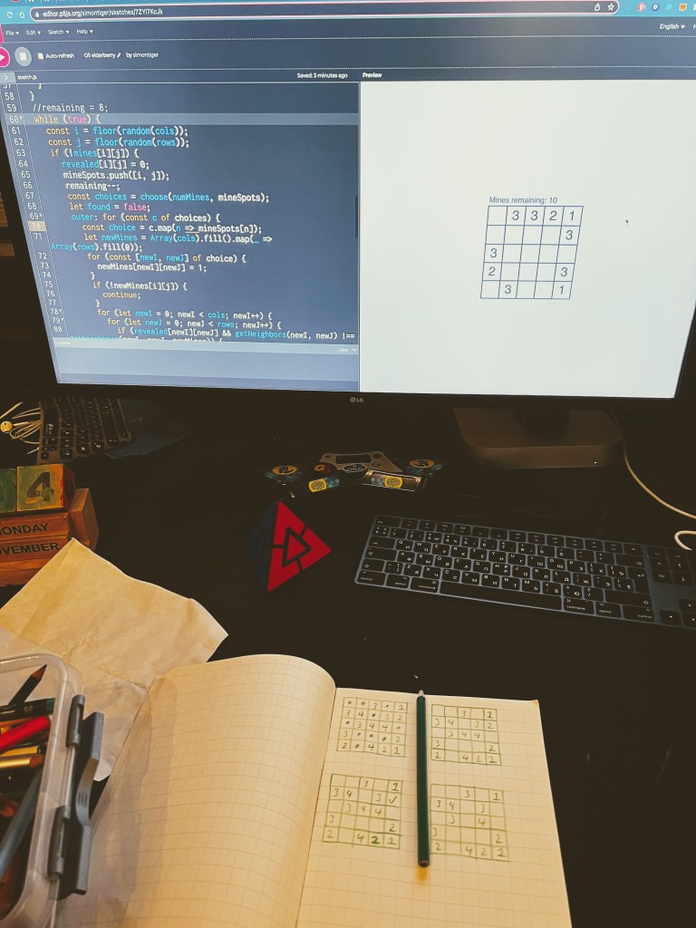In November and early December, Simon spent quite a few hours working on a clone of the new puzzle game 14 Minesweeper Variants. The puzzle generation algorithm he had to write was one of the most challenging algorithms he ever had to write.