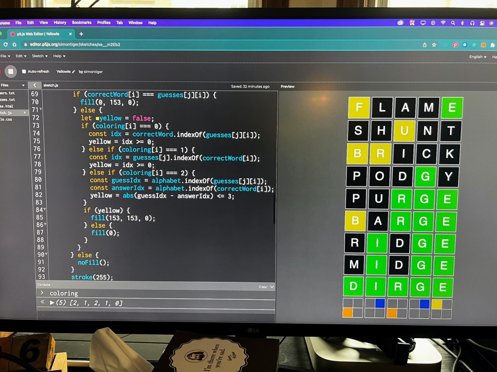 Simon has created a really mind-boggling version of Wordle: Yellowle. If you’re brave and don’t mind a headache, you can try Simon’s Yellowle here: https://editor.p5js.org/simontiger/full/1Va4ZUqKp